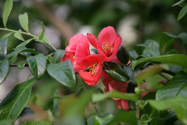 Rote Blüten eines Heckenstrauchs an der Terrasse