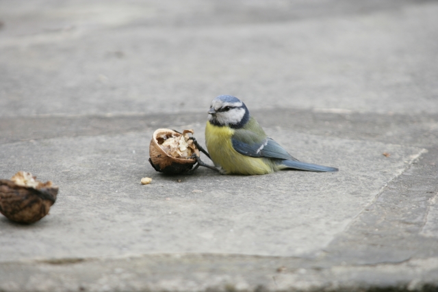auf der Terrasse krallt Walnuss mit beiden Füssen, von der Seite -