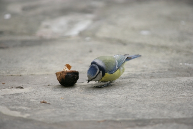 Blaumeise neben einer Walnuss - 500mm (Zoom)