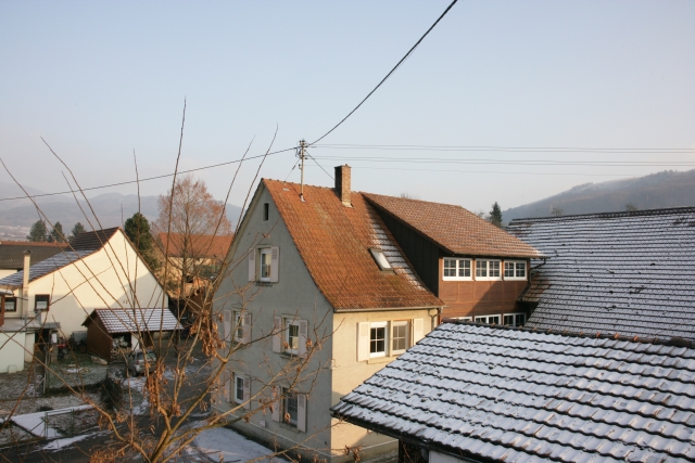 Haus mit dem Kamin, auf dem der Turmfalke sitzt, man kann ihn
