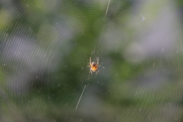 (junge?) Kreuzspinne im Netz zwischen Drachenbaum und Fenster, von oben