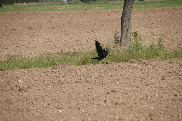 Rabe beim Abflug mit einer Walnuss im Schnabel - 300mm