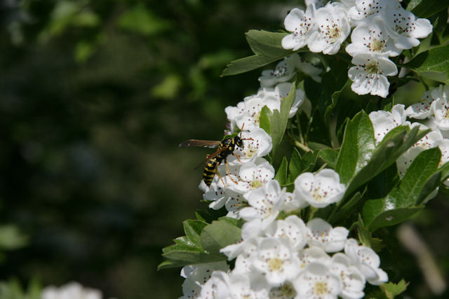 Wespe auf Blüte eines Strauchs am Bach, Wespe ist ziemlich scharf