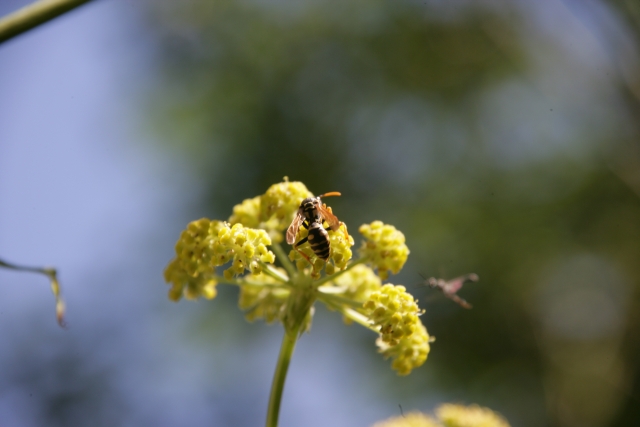 auf Blüte des Liebstöckels, von oben; rechts, unscharf