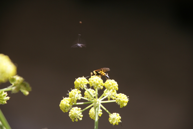 auf Blüte des Liebstöckels, von der Seite, im Hintergrund