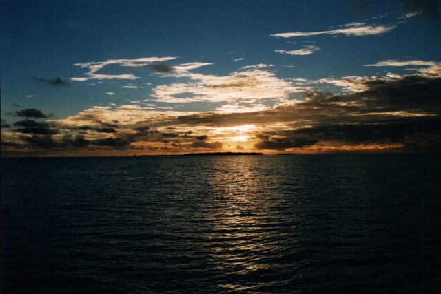 Blick vom Landungssteg über die Lagune auf die Nachbarinsel, währenddessen am Horizont die Sonne untergeht.