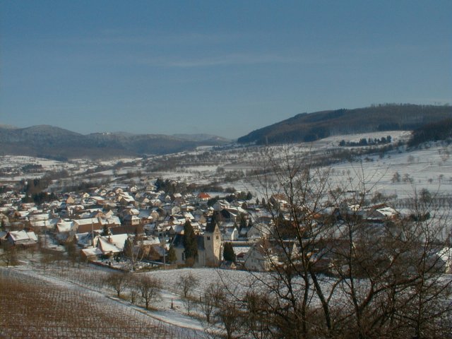 Niedereggenen - im Hintergrund, der weisse Klecks auf dem zweiten Hügel von rechts, ist Schloss Bürgeln. Irgendwo da unten steht unser Haus.